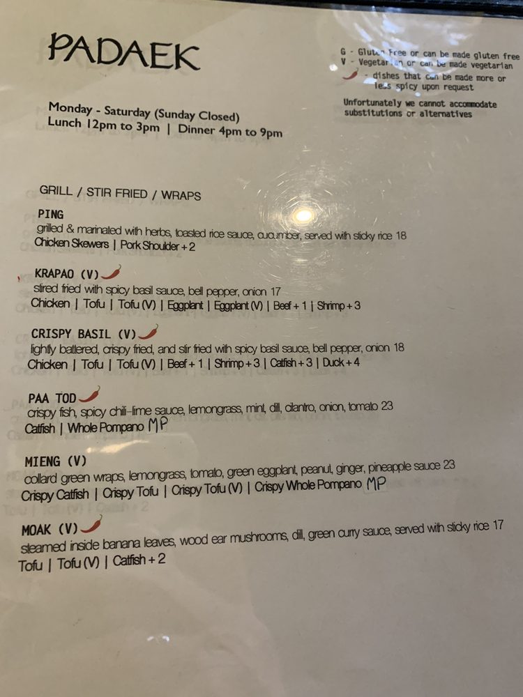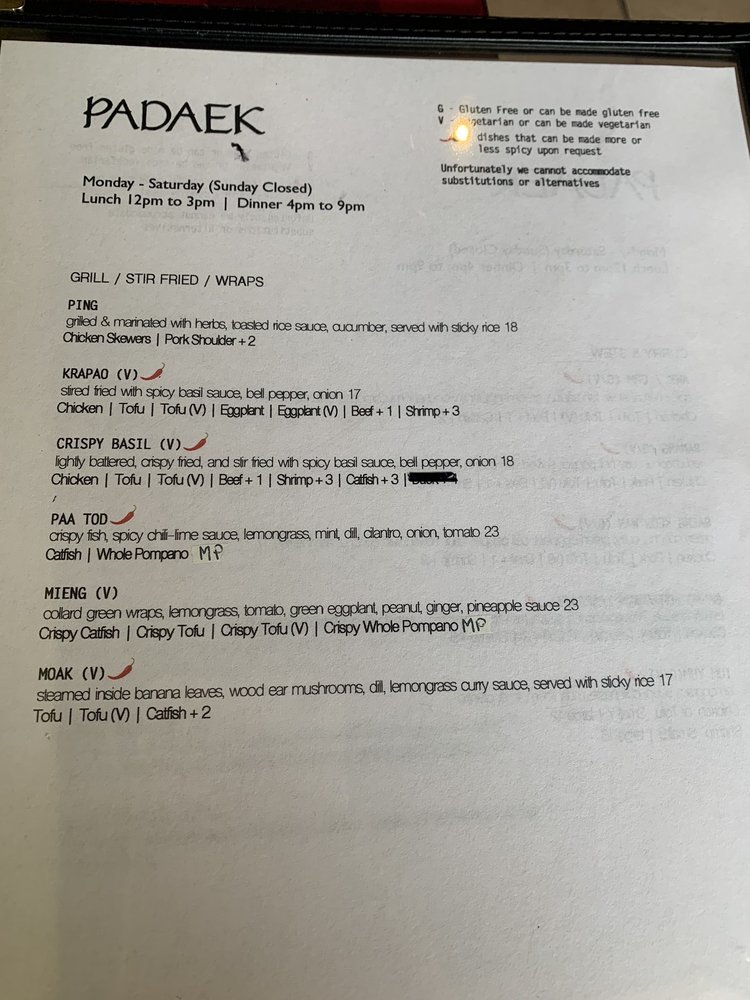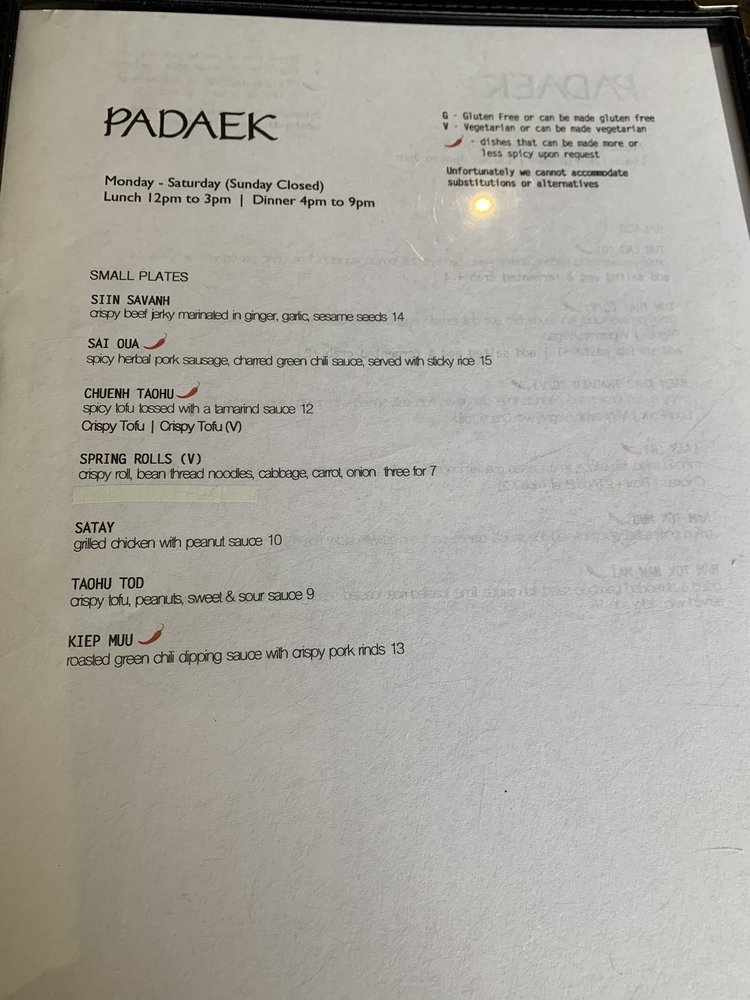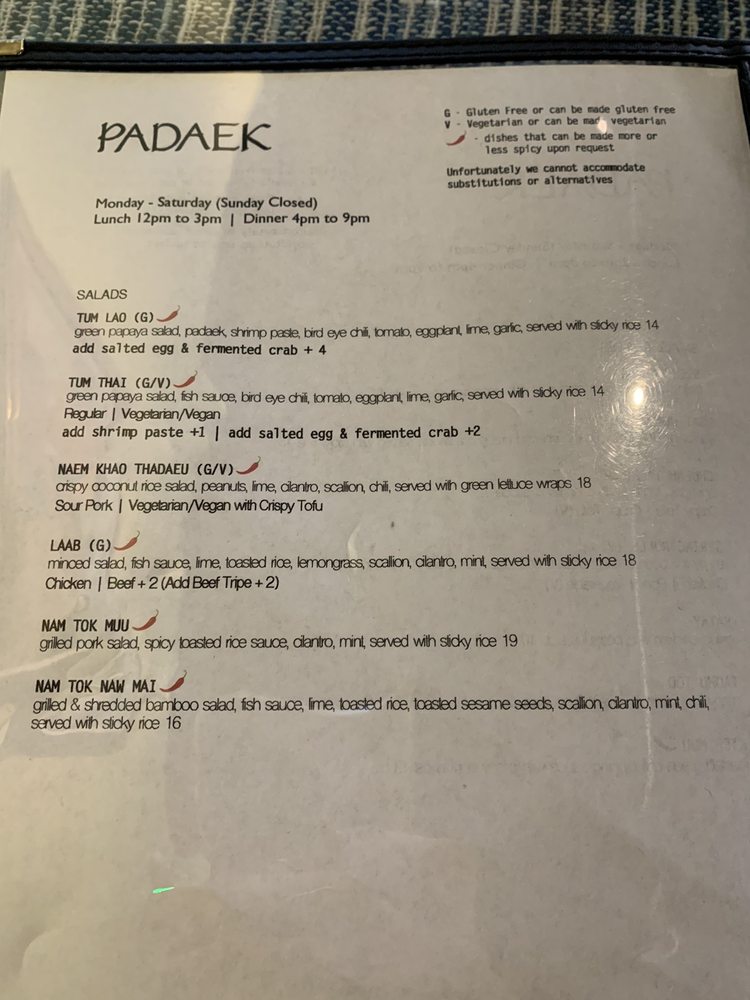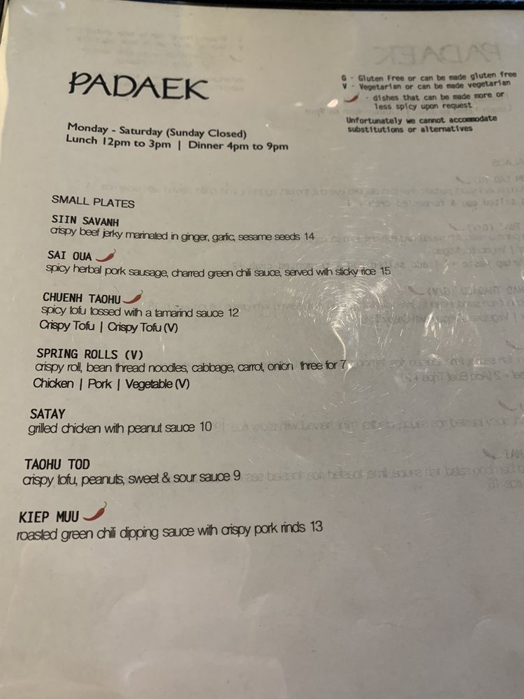 Introducing the menu at Padaek, a beloved Laotian restaurant in Falls Church, VA. Padaek offers a wide range of dishes with vegan and vegetarian options, and the menu includes favorites like Satay, Khao Poon, crispy coconut rice salad, and shrimp Padsewe. Customers rave about the flavorful and authentic dishes, highlighting standout items like the crispy basil chicken, Paa tod (crispy catfish), and the pork sausage appetizer with sticky rice. Reviews mention the attentive staff, reasonable prices, and cozy ambiance. Padaek is known for its attention to detail in preparation, from the lack of grease in the noodles to the juicy chicken in the Satay. Whether you're a fan of Thai or Laotian cuisine, Padaek offers a delicious and satisfying dining experience.
