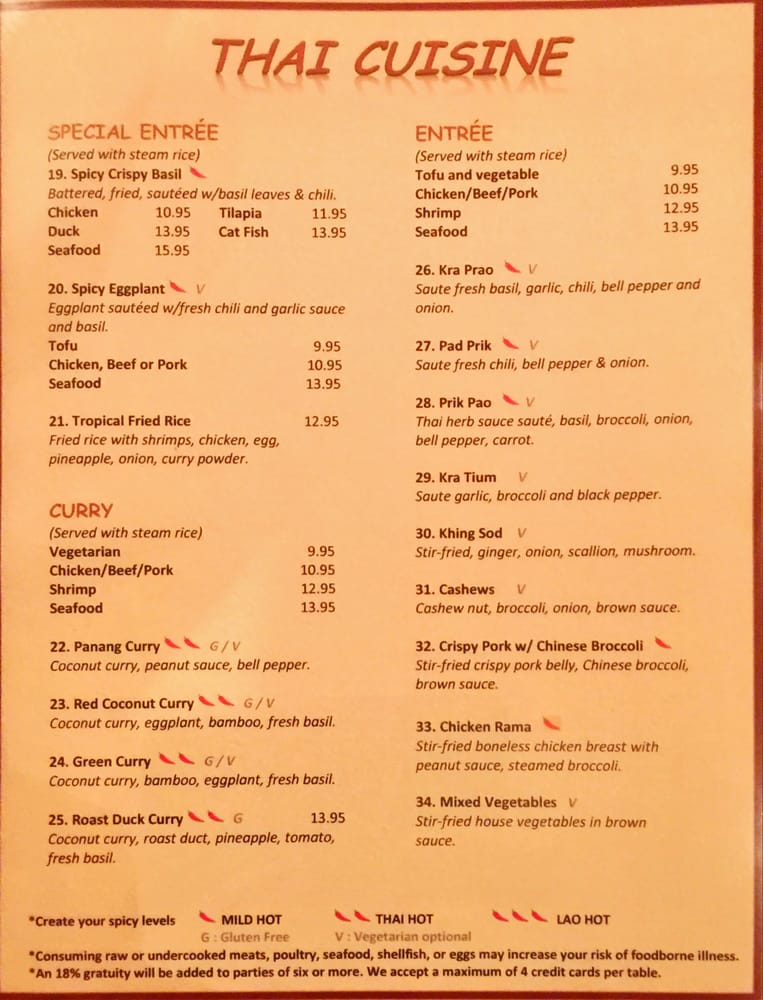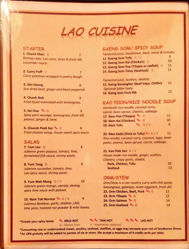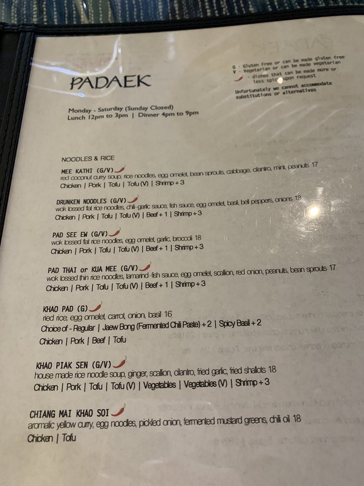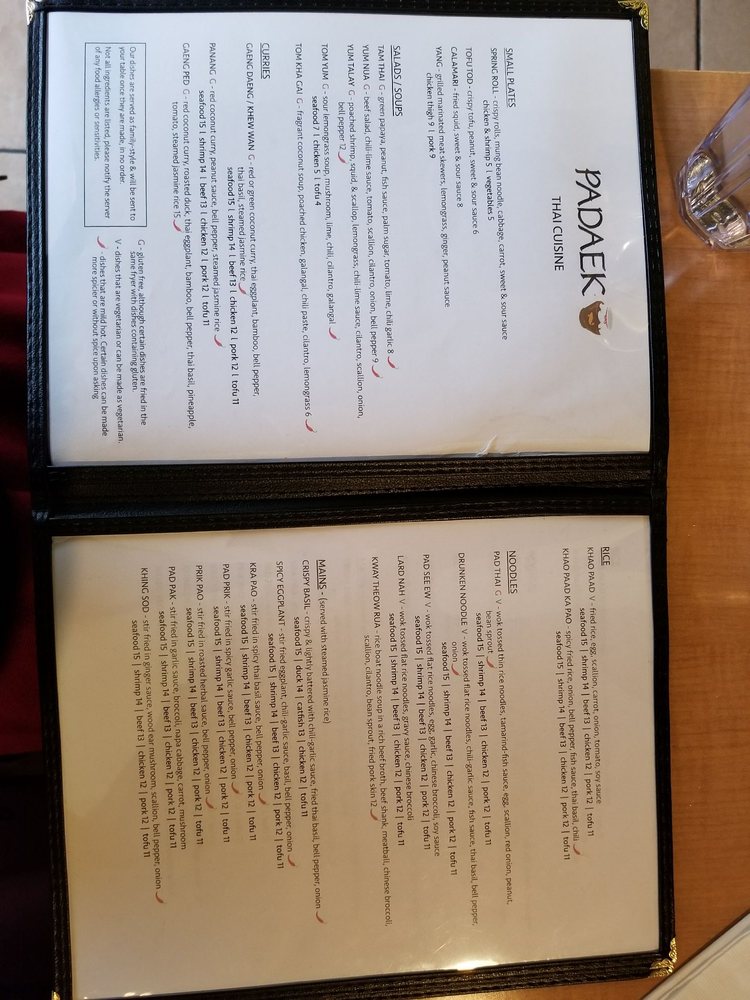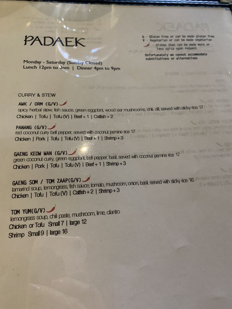 Introducing the menu at Padaek, a beloved Laotian restaurant in Falls Church, VA. Padaek offers a wide range of dishes with vegan and vegetarian options, and the menu includes favorites like Satay, Khao Poon, crispy coconut rice salad, and shrimp Padsewe. Customers rave about the flavorful and authentic dishes, highlighting standout items like the crispy basil chicken, Paa tod (crispy catfish), and the pork sausage appetizer with sticky rice. Reviews mention the attentive staff, reasonable prices, and cozy ambiance. Padaek is known for its attention to detail in preparation, from the lack of grease in the noodles to the juicy chicken in the Satay. Whether you're a fan of Thai or Laotian cuisine, Padaek offers a delicious and satisfying dining experience.